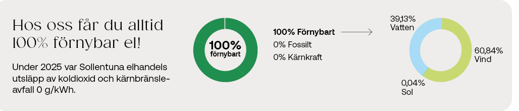 Som Sollentunabornas egna elbolag kan du känna dig trygg med att vi har ditt bästa i fokus. Vi erbjuder bara elavtal med schyssta villkor, utan dolda avgifter och en kundtjänst som är lätt att komma i kontakt med. Dessutom går allt överskott som genereras i bolaget direkt tillbaka till kommunens olika verksamheter och dig som bor här.
