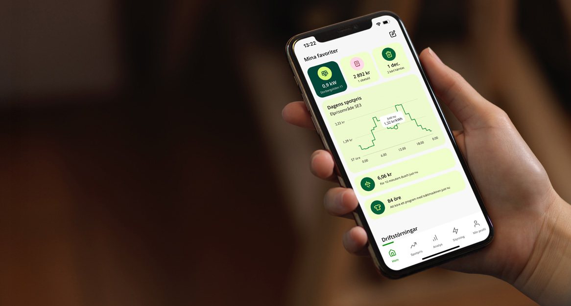 I SEOM-appen och på Mina sidor kan du följa din elanvändning varje kvart och se vilka tider på dygnet som drar mest el. Det gör det enklare att veta var det finns störst potential att spara.