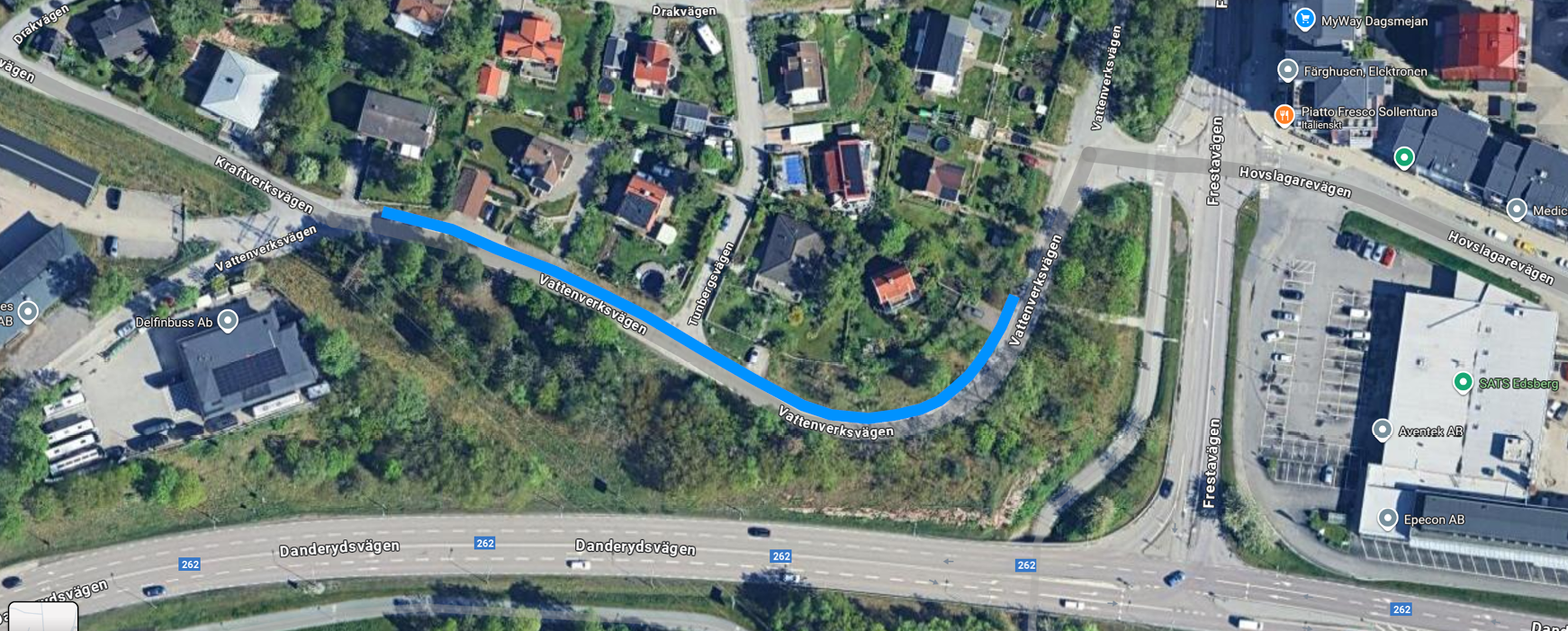 Vi utvecklar och bygger ut fjärrvärmenätet i Sollentuna. En sträcka som berörs av ledningsarbetet går från OKQ8 vid Sollentunavägen (262) och längs Vattenverksvägen till Frestavägen (bild 1).