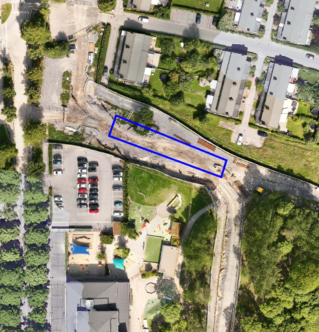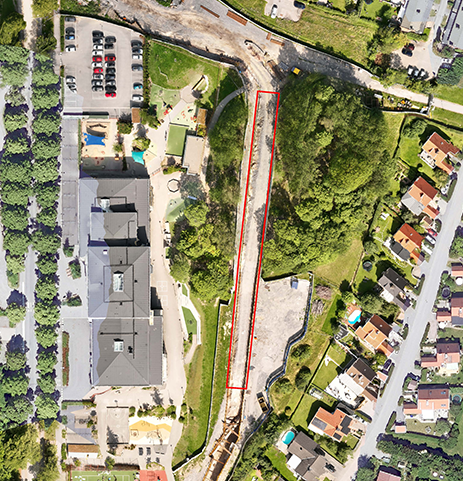 Bergsprängning påbörjas under vecka 42 (13–17 oktober) och beräknas pågå till och med januari 2026. Arbetet kommer att utföras inom rödmarkerat område (bild 2) med start i södra delen och successivt förflyttas norrut. Planering kring bergsprängning görs i samråd med skola och förskola.