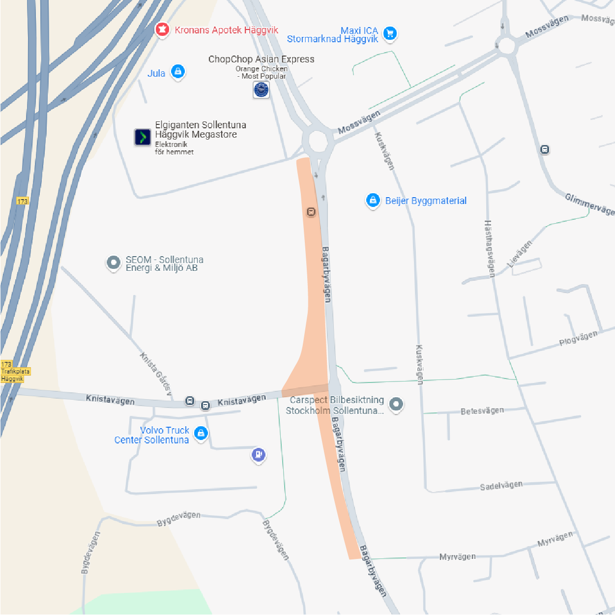 Så kan det påverka dig: Gång- och cykelbana längs Bagarbyvägen utmed arbetssträckan är avstängd. Knistavägen, i korsningen mot Bagarbyvägen, kommer asfalteras senast den 13 mars 2026, vilket utförs under kvälls- och nattetid, mellan kl. 20:00-06:00.