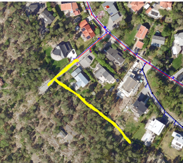 Enligt detaljplanen Falkberget ska ledningsnätet byggas ut fram till de nya fastigheterna. Vi ansvarar för utbyggnaden av ledningsnätet som kommer att dras enligt gul markering i bild 1.
