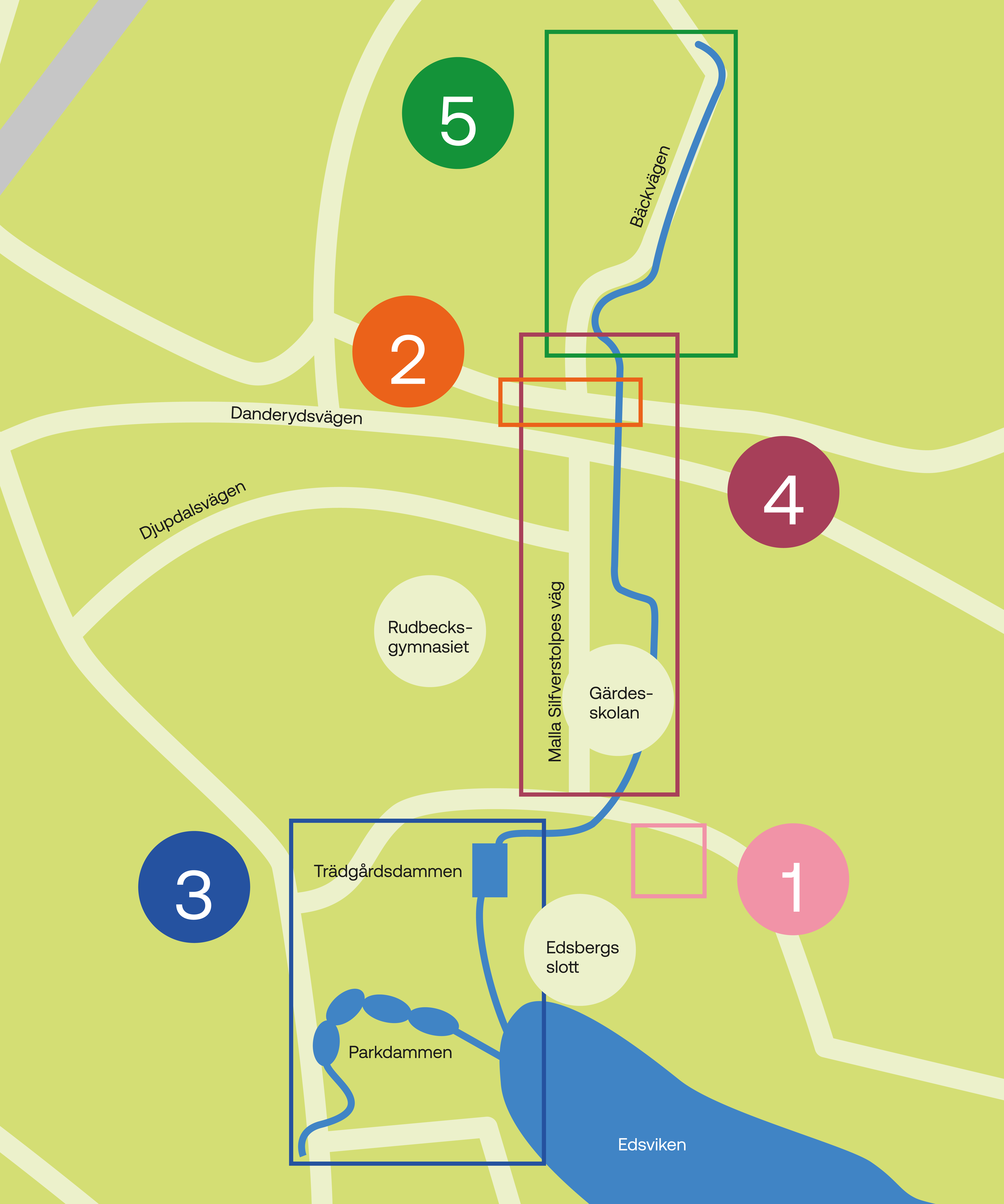 Projektet sträcker sig från Edsbergsparken i söder till Skogsängsvägen i norr och genomförs stegvis i flera etapper. Etapp 1 och 2 är avslutade. Här kan du läsa om pågående etapper 3 och 4 samt kommande etapp 5.