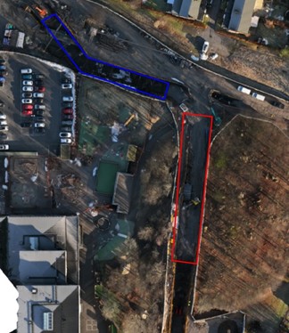 Arbete med att lägga ner ledningar och fylla igen marken pågår inom det blåmarkerade området (Bild 2). Arbetet beräknas pågå till och med juni 2026.