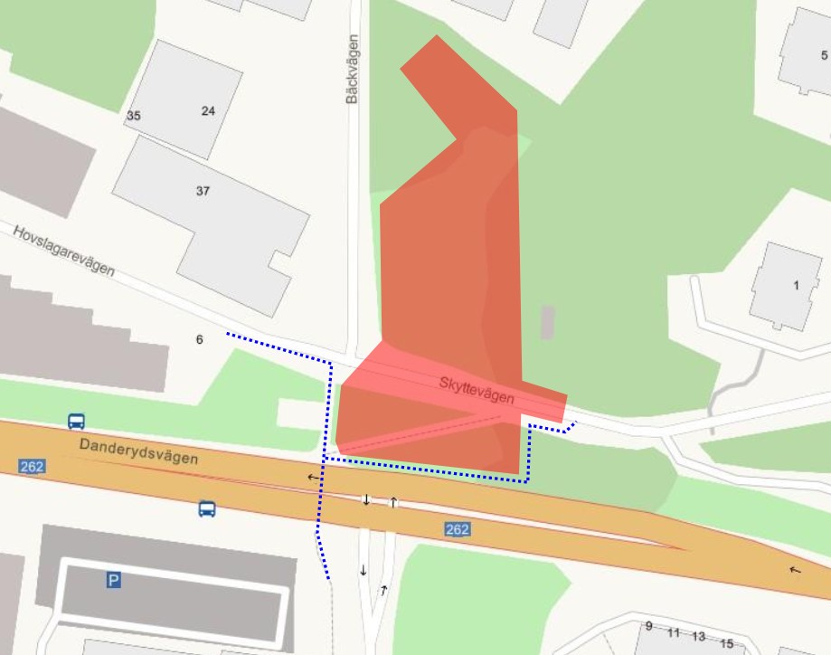 Skyttevägen mot Hovslagarevägen/Bäckvägen är avstängd till början av maj 2026 (Bild 1). Biltrafik till och från Skyttevägen leds via Ribbings väg. För gång- och cykeltrafik finns en provisorisk väg förbi arbetsområdet. Byggtrafik kör till och från arbetsområdet via Hovslagarevägen och Frestavägen. Avstängningen beror på arbete med nya och befintliga ledningar i riktning mot Väsjön.